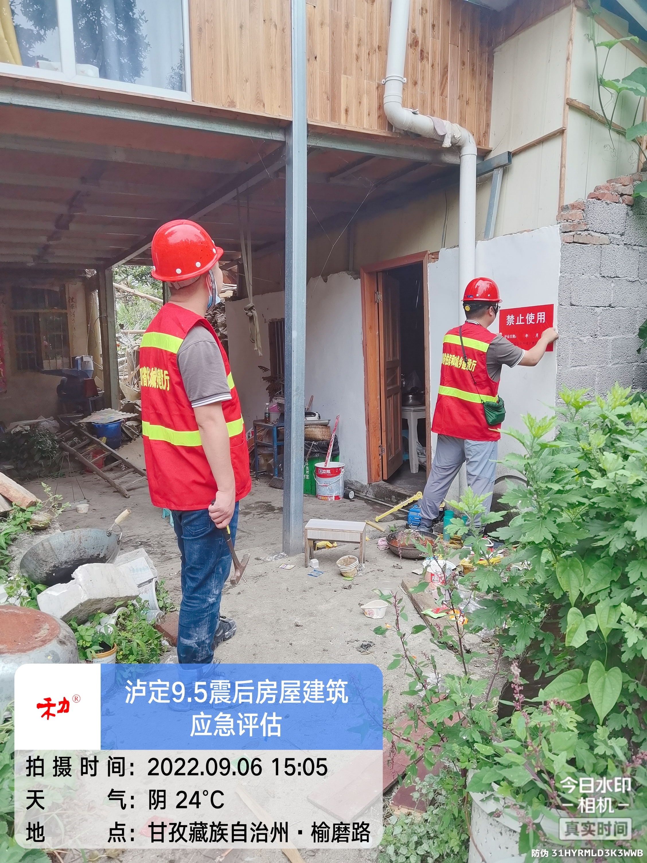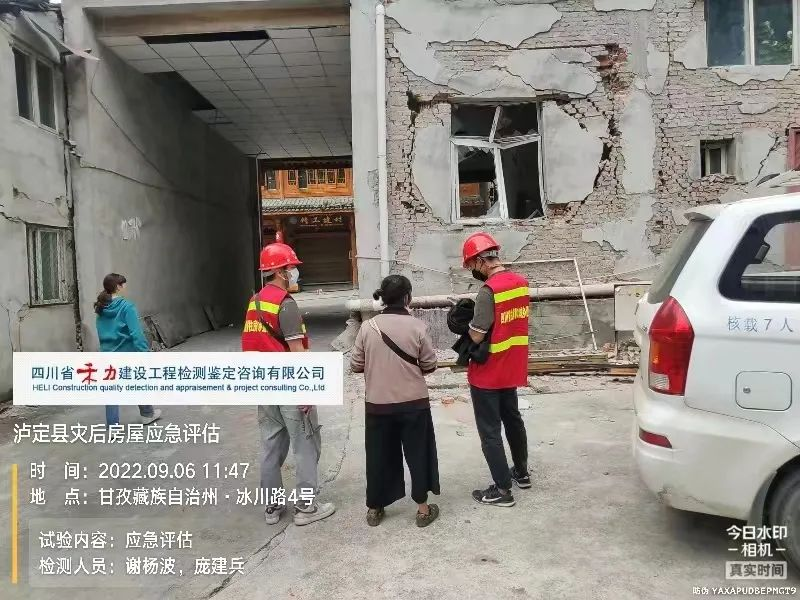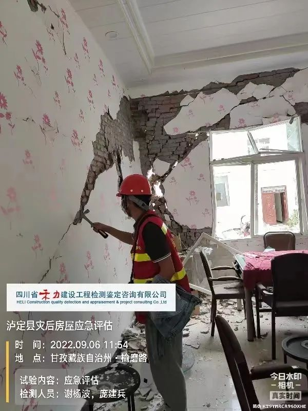 禾力团队到达海螺沟磨西镇后,对地震主要造成的房屋墙体开裂、墙体坍塌、地基变形、屋面瓦滑落脱落等破坏情况进行应急评估工作,为震后房屋建筑能否安全使用提出专业意见。